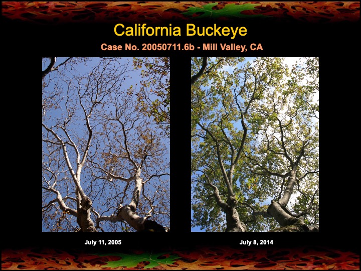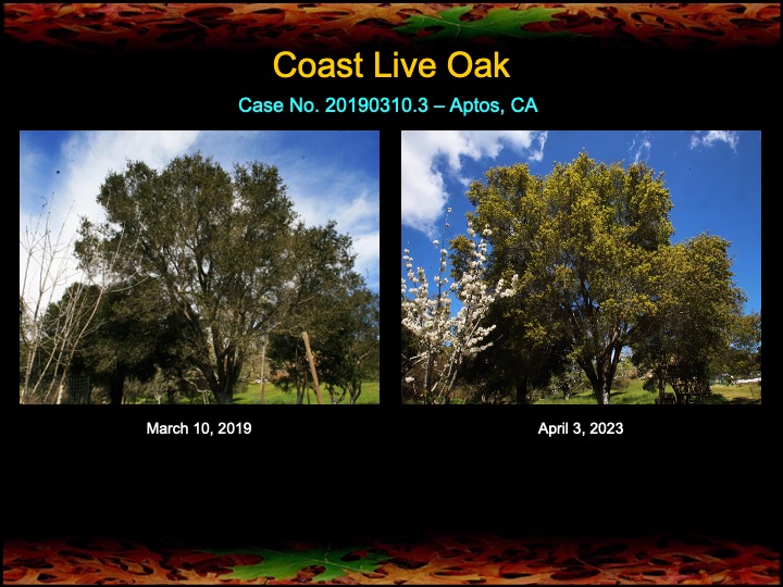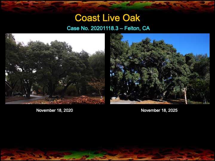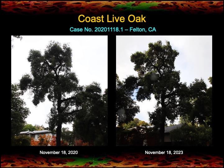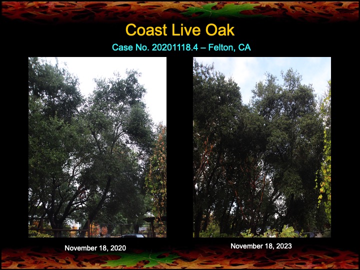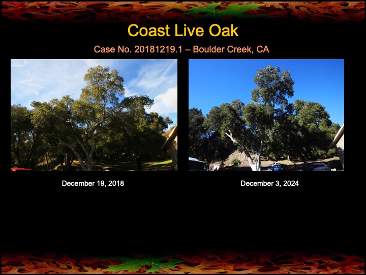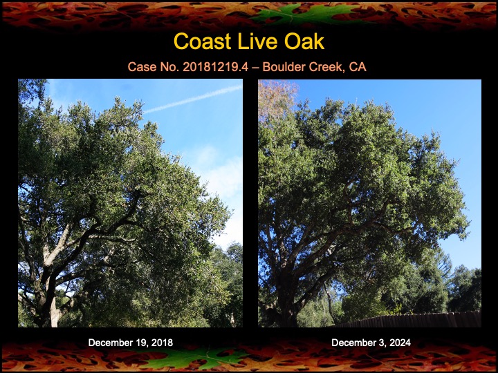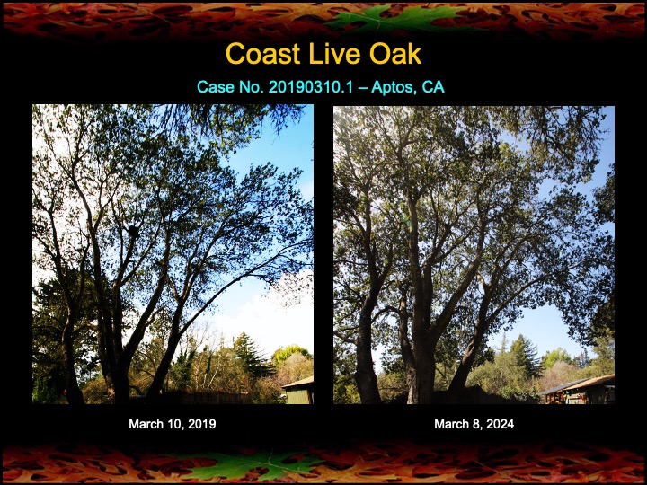 While most of my results are with coast live oaks, I also work with other kinds of oaks. Here are a set of results among black oaks I’ve obtained this past year using fire mimicry methods. Several of these black oaks were severely diseased with Sudden Oak Death infections. The oaks were given compost tea, soil mineral, and limewash treatments, as well as the surgical removal and cauterization of a Sudden Oak Death infection. The surgeries appear to have worked well, as the canopies have improved in lushness and density and there are no lingering infections in the remaining trunk tissues.