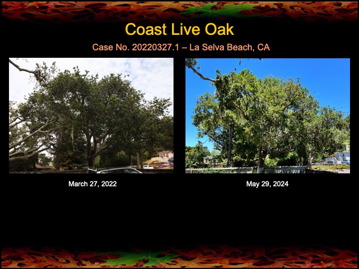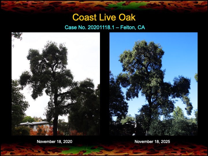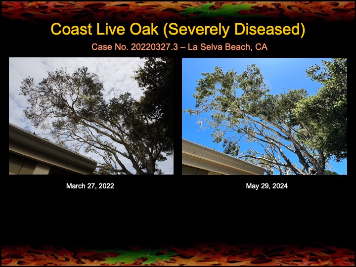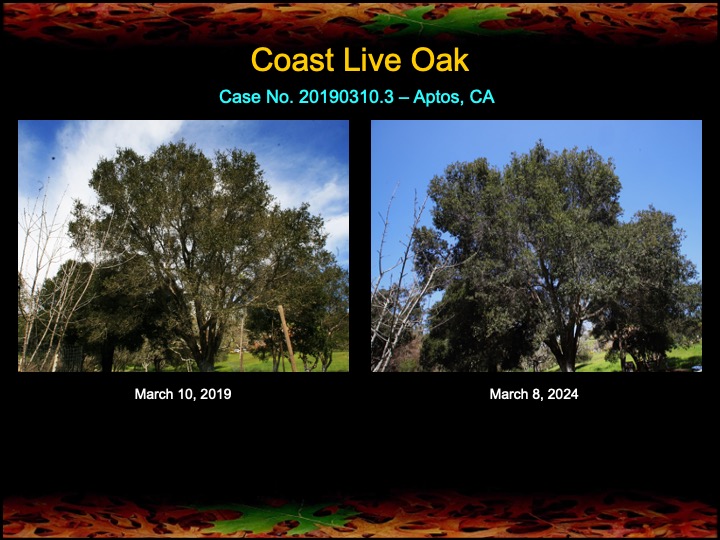 The images here indicate that most of the oaks have responded favorably to the treatments as seen in the increase in foliage density and lushness. It still truly amazes me that a few hours of work once a year can make such a difference for an oak grove.