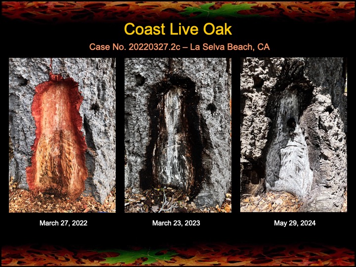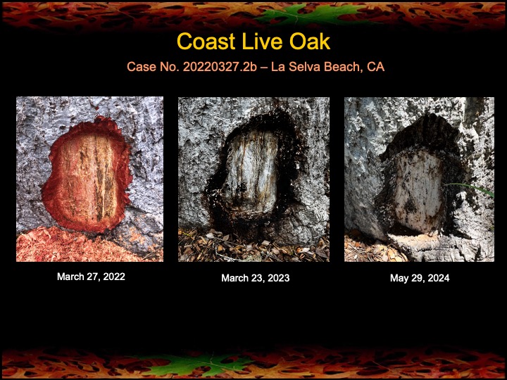 The coast live oak shown above was severely diseased with two large stem canker infections when I first arrived two years ago. Without promises of recover, I suggested two surgical procedures, as well as fire mimicry treatments to this and several non-diseased neighboring oaks. Below are the two surgical wounds depicting two years of healing. Note there is no residual bleeding or other signs of stem canker infection. Remaining photo sets below show the responses of the neighboring oaks to fire mimicry treatments. Happy to report that we’ll be returning soon to treat these oaks again.