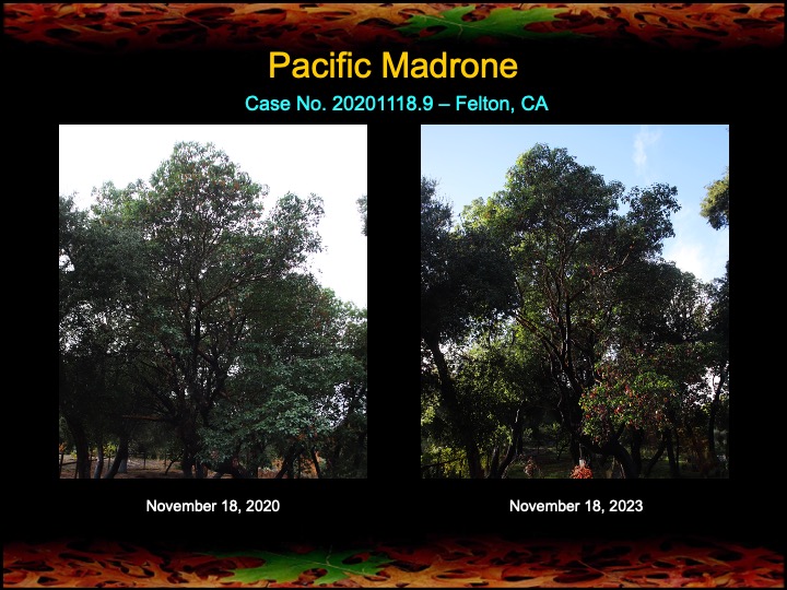 In November 2020 I began fire mimicry treatments on several coast live oaks and Pacific madrones in Felton, CA. Last year, when I checked on these trees, they were already showing a nice improvement (see here). Now after two years nearly all of the trees are showing noticeable positive responses to the treatments, even at the height of drought conditions. Several of the oaks have undergone major stem canker surgeries, but still seem to be on the mend. Hope you enjoy these results as much as these trees.