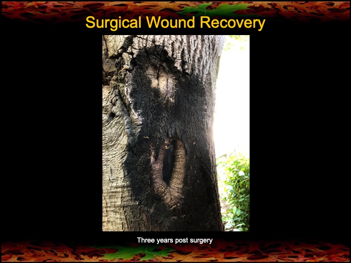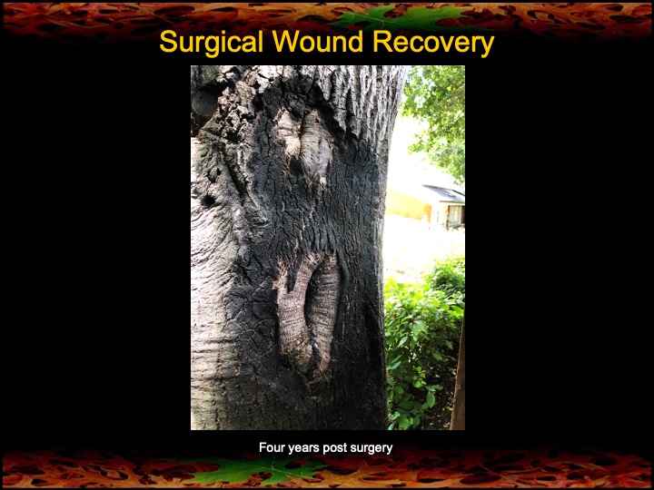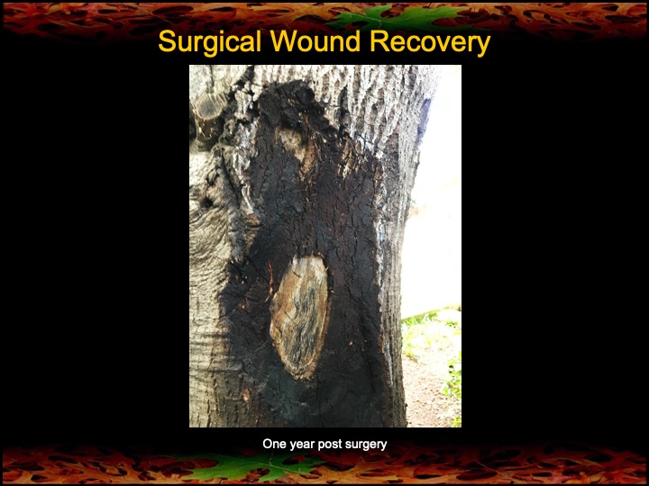 Note, also, the last two photo sets that show the rapid recovery of two surgical wounds (on the same old-growth oak). The absence of any residual bleeding from the wounds indicates that the surgeries were successful in removing the stem canker infections. I’m calling this a win!